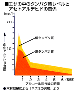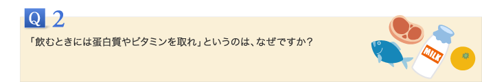 アルコール分のほとんどは肝臓が分解してくれます。アルコールをたくさん飲めば、アルコール脱水素酵素などのアルコールの代謝に関わる酵素が消耗されます。この酵素系を補うためには蛋白質やビタミンが必要になるわけです。従って、蛋白質やビタミンが不足している状態では、この酵素の働きは弱ってしまうことになります。これらをとらずに飲めば肝臓の負担を大きくしてしまうのです。このほかにも、ビタミンB群などはアルコールを飲むと吸収されにくいことが知られています。ですから、日常の食生活で良質な蛋白質やビタミンを十分にとる必要があるのです。これはまた、肝臓を丈夫に維持していくためにも必要なことなんです。十分に蛋白質を摂取している場合は、二日酔いや悪酔いの原因となるアセトアルデヒド(アルコールが酸化するときに出てくる中間体)ができにくいのです。気持ちよく飲むためにも、刺身などの肴は有用なのです。