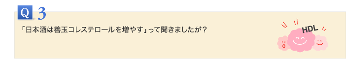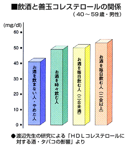 心臓の動脈硬化は、血清総コレステロールが高くなると促進されます。ところで、総コレステロールにはいわゆる善玉コレステロール(HDLコレステロール)と悪玉コレステロール(LDLコレステロール)の2種類があります。このうち、善玉コレステロールには、血管や組織に溜まったコレステロールを肝臓に逆輸送して処理するという働きがあります。つまり、総コレステロールが高くても、善玉のほうが多ければ動脈硬化になりにくい、ということです。そしてご質問のように、適量のお酒を飲むと、この善玉コレステロールが増えるという効果が現われます。心筋梗塞の主な発生原因は、高血圧と高コレステロール血症で、お酒は悪影響しないというのが現在の常識です。むしろ、ふだんからお酒を飲んでいる人のほうが心筋梗塞にかかりにくい、というデータが多数あります。血圧との関係なら、お酒よりはむしろ塩分の取りすぎと肥満に気をつけましょう。