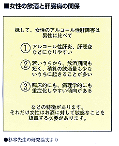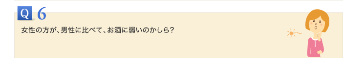 女性のほうが男性に比べてアルコールに感受性が高いのは事実です。その理由には、いろいろなことが考えられます。まずアルコールの処理能力に対する女性ホルモンの関与。また、女性に多い膠原病で見られる自己免疫現象(自分を他のものとみなして強い炎症が起こる現象)が、アルコールをきっかけに起こるという可能性もあります。そして基本的に女性は男性に比べて平均的に体が小さく、アルコールを処理する肝臓が相対的に小さいということも関係があるでしょう。それだけ女性の体はデリケートにできているわけですが、はっきりと「男性とはここが違うから」という結論は出ていないのが現状です。ただ私たちの研究でも、女性の感受性の高さは実証されています。多くの女性がお酒を飲み始めるようになった今、女性はお酒に対してとても敏感なんだということを自覚したうえで自分の適量を知り、それを守ることが大切だと思います。