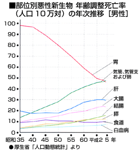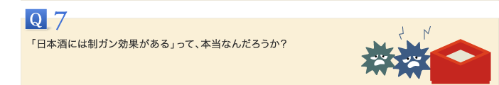 戦後の日本の全国市町村別標準化死亡比を見ると、肝硬変や肝ガンによる死亡率に大きな地域差があることがわかります。そこで、全国のアルコール消費量を種類別に比較照合してみたところ、東北地方を中心とする東日本、つまり日本酒をよく飲む地方の人たちの死亡率が非常に低いことがわかりました。つぎに、ヒトのガン細胞に日本酒の濃縮液を添加する実験を行ったところ、ガン細胞の増殖が著しく抑制されました。こうした結果は、ウイスキーやブランデーでは認められないもので、そこから日本酒に含まれる何らかの成分がガン細胞増殖抑制作用を持つのではないかと考えたのです。戦後ずっと肝硬変、肝ガン死亡が東低西高の地域差を示しているという事象は、私たちの実験結果が裏づけているといえるかもしれません。日本酒のどの成分が制ガン作用を持つのかの特定が今後の課題として残されてはいますが、日本酒の効果は、事実として知ってほしいと思います。