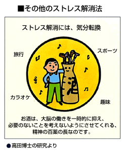 本来ストレスとは、動物が危険から身を守るための交感神経を中心にした体全体の生存防衛反応でした。ところが現代人は常に頭の中で危機感を持ちこのシステムが働きっぱなしになっています。こうしたストレス過剰の状態だと、血管の内側の内皮細胞にコレステロールが溜まるようになって動脈硬化が起こり、そこで血が固まって血栓症を起こします。これが心臓に起これば心筋梗塞、脳に発生すれば脳梗塞となるわけです。これに対して、お酒には血管を拡張して血液の通りを円滑にする働きがあり、血栓症を予防してくれるという大きな効能が認められています。糖尿病のひきがねともなるやっかいなストレス。現代の医学では、万病の元ともいえるこのストレスを、いかに解消し慢性化を防ぐかが大きな課題とされていますが、お酒は明らかにストレスに関連した疾患の数を減らしてくれるのです。適量の飲酒がもたらす大きな効果、ストレス解消にはお酒が良いという由縁です。