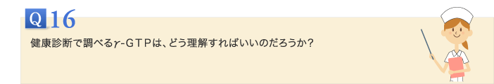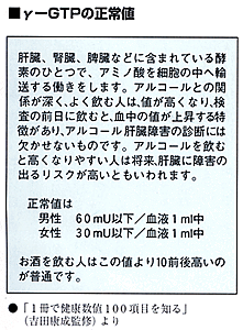 γ-GTP(グルタミルトランスペプチターゼ)の値は、アルコール摂取により特異的に高くなります。γ-GTPが高いということは、アルコールに対して肝臓が警告を発しているということですが、だからといって、それが即肝障害を意味するものではありません。肝臓がアルコールのメインの代謝臓器であることから、アルコール=肝障害という認識がありますが、それは大きな間違いで、日本人の場合、欧米人と比べてアルコール性肝炎や肝硬変といったアルコールだけが原因の肝障害は少ないのです。それよりは、γ-GTPを手がかりに、アルコールに一番敏感な肝臓をチェックすることと、これは人それぞれによって違いますが、胃とか腸とか膵臓とか、その人のお酒に対して一番弱い臓器、いわばアキレス腱に障害がないかどうかを発見するキッカケにしてほしいと思います。それらの臓器は、肝臓のγ-GTPのように簡単には症状を表わしません。お酒が好きなら、定期健診は必ず受けましょう。