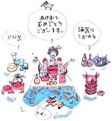 まずはお正月のお酒から。派手やかな金箔入り、すっきりした吟醸酒、炭酸ガスを含んだ個性的なにごり酒、骨太の純米酒、飲みなれたパック酒、小瓶の生酒など、お酒は好きなものを自由に選んでください。